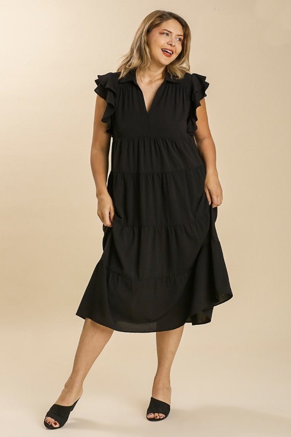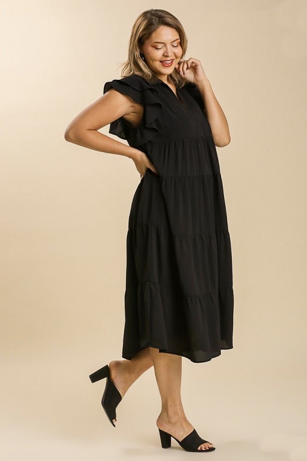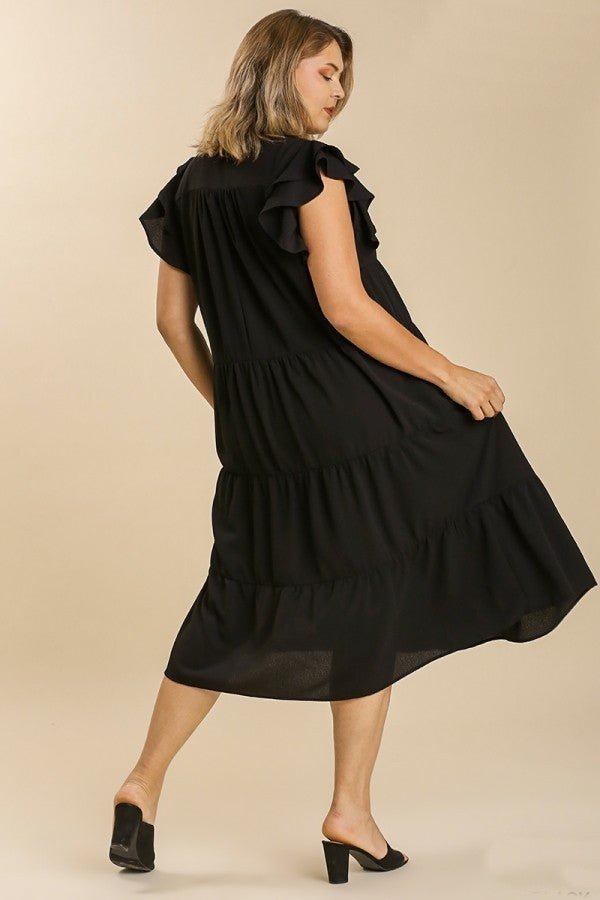 Home Dresses Umgee Tiered Midi Dress with Ruffled Sleeves in Black ON ORDER