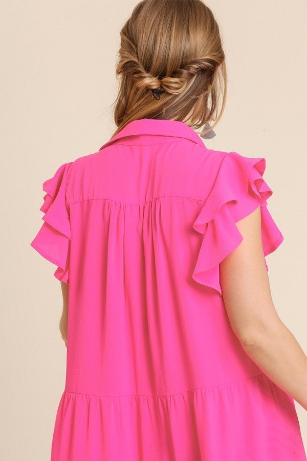 This Umgee dress features a tiered design, midi length, ruffled short sleeves, and a collared split neckline.